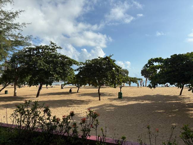 Catch the bus from the city centre. Several shops and stalls for mainly tourist items at keen prices. I bought a tablecloth and some embroidered bags. Near here is the beach. Find some shade and watch the waves.